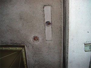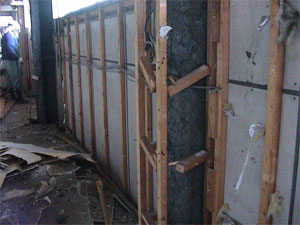 柱の内装材を取り除いた所柱枠の木の下に現れた吹きつけ石綿