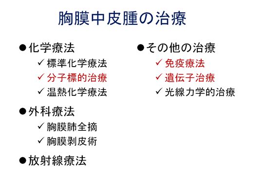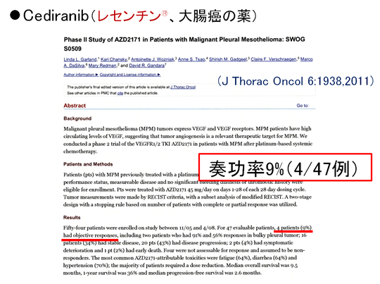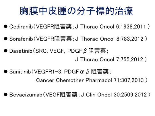胸膜中皮腫に、肺がん他の分子標的治療が効くのではないかと、市場に出ている分子標的治療薬を中皮腫に片っ端から試し研究している面があります。