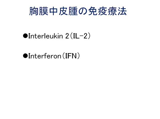胸膜中皮腫の免疫療法の考え方は昔からあり、自分の細胞の力で腫瘍を押さえてゆくというものです。自分の免疫を逃れて大きくなったのが、がんですので、簡単には行きません。中皮腫の領域で使われたのは、主に2つで、図に示したインターロイキン2(IL−2)とインターフェロン(IFN)です。
