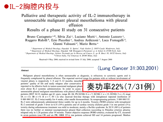 図は、胸腔内にインターロイキン2を投与した2001年発表のイタリアの研究ですが、第2相試験で胸水の溜まっているところ、奏功率22%(31人中7人)でした。少しは効いている程度で、十分効いている数字ではありません。奏功率とは、治療をされた患者さんの中で、腫瘍が消える状態や腫瘍面積が半分になる状態が1カ月続いている患者さんの割合を示したものです。