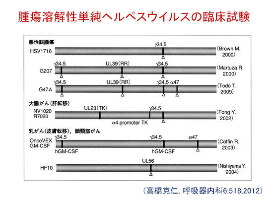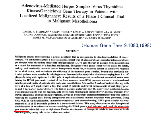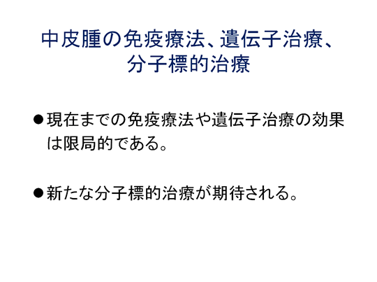 最近の試みとして、少し遺伝子治療とは趣が違いますが、腫瘍溶解性単純ヘルペスウイルスがあります。ヘルペスウイルスに遺伝的操作を加えて、脳腫瘍や大腸がんや乳がんに入れた時のみウイルスが増えてがんが溶けることを目指している研究者がいます。中皮腫へ応用してみてはどうかということです。