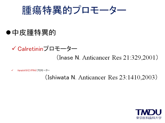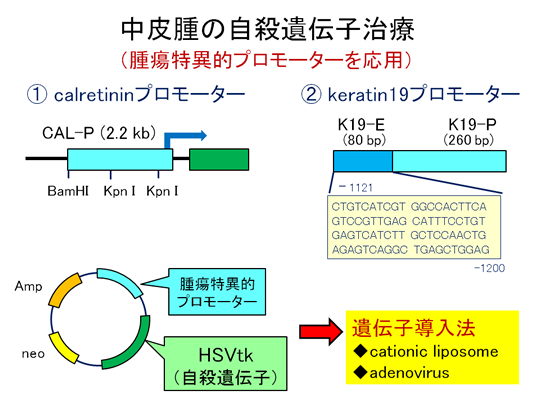 私たちも基礎的研究として、単に自殺遺伝子を入れるだけでなく、自殺遺伝子の上に腫瘍特異的プロモーターを組み込んで、中皮腫に入れる工夫をする研究をしました。正常な細胞では何も起こさずに、中皮腫に入った時のみ作用するスイッチのような物を入れたらどうかという発想でした。