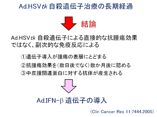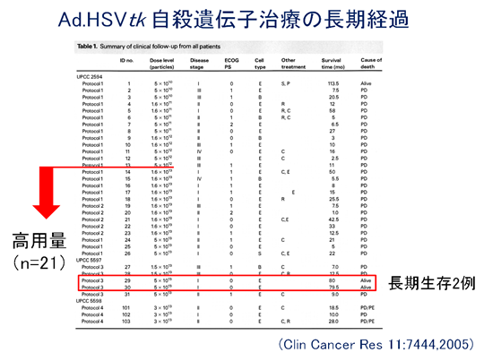 アルベルダ先生の研究は良い結果が出ず、陽の目を見ませんでした。2005年の論文(上)では、これぞという患者さん21人に高用量の遺伝子治療を行なった結果がありますが、2人のみ長期生存で劇的効果はなかったということでした。しかもこの2人は直接的な腫瘍効果でなく、それに伴う免疫的効果で生存したと結論しています(中)(下)。理由は様々だったようですが、自殺遺伝子研究は幕を閉じました。結局、免疫反応研究に戻ったのでした。