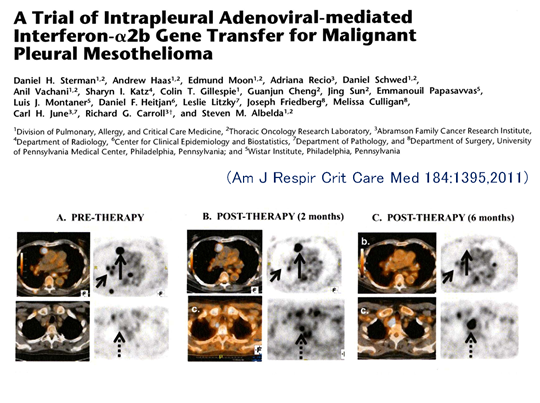 今アルベルダ先生は、インターフェロン遺伝子を胸腔内に入れるとインターフェロンそのものは消えてしまうかも知れないが、遺伝子の効果は広がってゆくのではないかという趣旨で研究をされているようです。2011年の論文のインターフェロンの遺伝子を入れた試験ですが、データとしてはまだまだです。年1回のアメリカ胸部疾患学会でアルベルダ先生が表彰され、私も講演を聴きました。題名は「長く曲がりくねった道」で、ご苦労されている様子が伺えました。