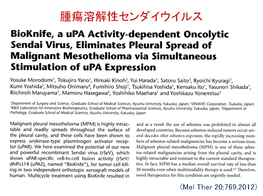 腫瘍溶解性センダンウイルスは、中皮腫に対して実験中です。私の知る限りでは遺伝子治療で、2014年6月段階で人に対する臨床試験は行なわれていません。2014年6月段階で、まだ成果はないという状況です。
