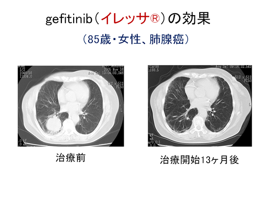 分子標的治療は抗がん剤の一種です。肺がん治療の分子標的薬であるイレッサは、2002年から使用されています。この例では85歳の方のがんがほとんど無くなっています。このような劇的効果は従来の抗がん剤にはないので、びっくりした訳です。但し、ごく一部の人にしか効かないこともわかってきました。狙いが合った人だけに効くのです。逆に効かない人には全く効かないというメリハリのあるのが分子標的治療の特色です。
