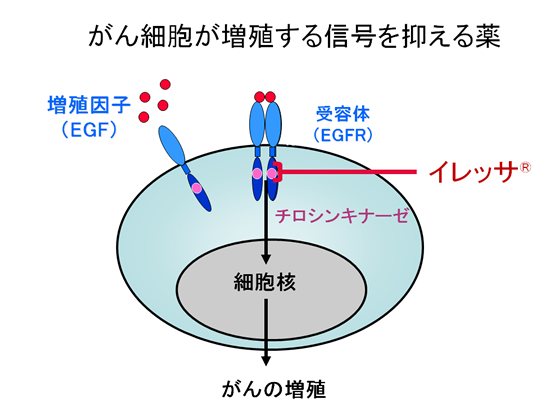 イレッサが効く場所もわかっています。がん細胞の増殖因子の受容体(EGFR)という部分が暴走するとがん細胞が増えてゆくので、ここにイレッサが効くのです。しかし、この暴走以外の理由でも肺がんになるので、その場合は効きません。