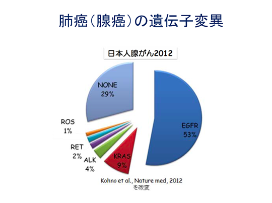 肺がんの中では、腺がん(肺がんには、他に小細胞がん、扁平上皮がん、大細胞がん、等ある)に多いタイプですが、その内でイレッサの対象となるFGFRの遺伝子変異のある場合は半分くらいです。遺伝子のタイプがだんだん解って来て、ALKというタイプがあり、2013年4月にはALK対象の薬が出ました。