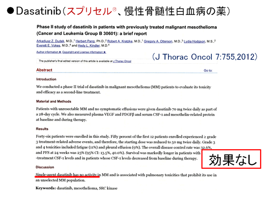 スプリセルは慢性骨髄性白血病の薬で、分子標的治療では最も成功した薬です。効果も持続する夢のような薬ですが、中皮腫には全く効きませんでした。