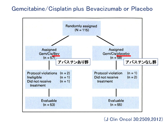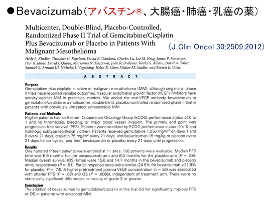 アバスチンは、大腸がんや肺がんで使う薬です(上)。アバスチン有りと無しの2群に分けて胸膜中皮腫に臨床試験をしましたが、結果は両者の差が全くありませんでした(下)(下二つ目)。アバスチンを加えても何も変わらないという大変残念なものでした。肺がんでは効果的なのですが、中皮腫では効果がないという結果です。2014年前の数年の研究結果では、中皮腫の分子標的治療は否定的な結論が多くなっています。