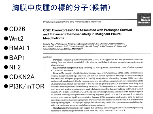 候補になる標的分子はたくさんあります(CD26、Wnt2、BMAL1、BAP1、NF2、CDKN2A、PI3K/mTOR)。これらの遺伝子に狙いを定めて行くのが現状です。
