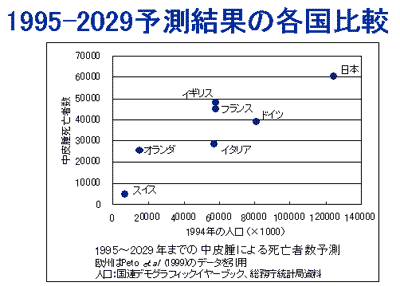 悪性中皮腫は大変な病気で、関東で悪性胸膜中皮腫に詳しい横須賀共済病院の三浦医師等のデータでは、1年から2年以内に亡くなり、5年以上生存率が低いのが実情です(図6)。これは早稲田大学の村山先生や産業医大の高橋先生と私どもが一緒になって研究した、日本の中皮腫の将来予測です(図7)。今までの中皮腫の死亡者数をもとに、数学的に予測したものです。潜伏期間が40年くらいあるので、今病気になっている方は40年前にアスベストに曝露したことになります。いままで日本は大量に石綿(アスベスト)を使ってきていますから、これから40年後に病気になる方がたくさんいます。そういうものを予測していくと、2040年代までに悪性胸膜中皮腫で10万人くらいの男性の方が亡くなるのではないかという予測であります。次の図は、他の国の予測図ですが、おおむね同じような危険度の予測になっています(図8)。