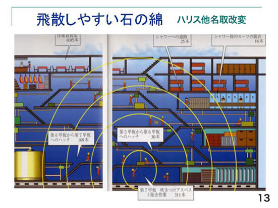 石綿は非常に飛散しやすいことが特色です(13)。1950〜60年にアメリカやイギリスでは石綿関連疾患が多発していました。そして様々な対策を立て始め、ノンアスベスト製品を使い始めています。その時に1940年頃の造船作業を再現したのが有名なハリスの再現実験です。「造船所で直接石綿(アスベスト)を触った以外の周りの人に石綿関連疾患が多発している。自分で石綿を扱っていない造船職員に石綿関連疾患が多発しているのは、なぜだろう?」ということで、確認の濃度測定を行ったのです。古い船を持ってきて石綿除去をするとどうか。一番下の吹付け石綿(アスベスト)除去作業で311本/ml、これはmlですごい高濃度だった。他の場所の数値を測定していくと、1階上が109本/ml、2階上で30本/ml、それ以外でも25本/mlです。タバコの間接ばく露と同じで、実際に周囲広く、10分の1位の濃度になることが分かりました。ハリスの論文を元に、この図は私が一部改変して作ったものです。石綿は非常に飛散しやすく、ビルのある階で改築している時に他の階に住み営業している場合が実情ですが、実はどういう濃度になっているか、一目瞭然でわかります。