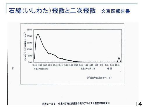 石綿の性質を考えるときに大切なのは、非常に落下しにくいという性質です(14)。これは、3.2平方メートルくらいの吹き付け石綿を除去した翌日の床清掃時の濃度です。15分床を箒で清掃します。すると、リットルでいうと2万本くらいの石綿濃度になります。10時に除去をして3時間後の1時で7000本/L、8時間後の18時に3000本/L、22時の12時間たって500/L本、15〜6時間経ったところで床に落ちる。石綿は、わた(綿)ですから長い時間がかかって落ちる。右端にもう一度ピークがあります。これは作業環境測定士が、この測定を終了するために二人で現場を歩いた部分です。一度床に落下した石綿が飛散し、また3000本/Lくらいにまであがってしまい、二次飛散と言います。石綿は飛散しやすく、落下しにくい、という二つの性格をもっている事を理解することが肝心です。