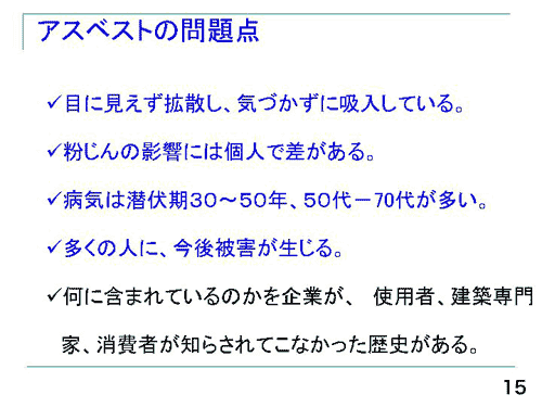 アスベストの影響は個人差があります。たとえば500人の工場があり実際はラインで働いている方のほうが高濃度に吸っているはずですが、その開発にあたった研究者が先に中皮腫になってしまうということもあります。病気の潜伏期間は40年くらい。今後、被害が生じるだろうということと、今までどの製品に含まれているかという情報を、企業が使用者や専門家や消費者に知らせてこなかったということがあって、全体的に商品知識が少ないことが問題となっています。
