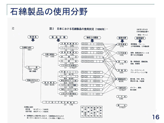 これは、1996年の石綿(アスベスト)消費の使用分野です。建築での使用が9割です(16)。