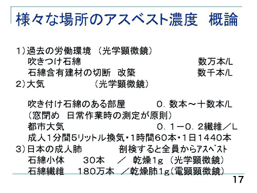 日本の一般大気中の石綿濃度は、1Lに0.1〜0.2本です(17)。この会場にも当然ありますし、一日1440本くらいの石綿繊維を、皆吸いながら生きているということが基本にあります。ですから日本の成人の肺を解剖して調べると、全員からアスベスト繊維やアスベスト小体が出てきます。図は私たちのデータですが、職業曝露も環境ばくろ歴も共に全くない方でも、乾燥した肺1グラムで30本くらいの石綿小体が光学顕微鏡で検出されます。電顕でみると、乾燥肺1グラムに180万本くらいの石綿の繊維が全員から出るのです。石綿(アスベスト)繊維のほとんどは肺に留まりますが、リンパの流れから全身に回り、肝臓や腎臓、脳や心筋でもわずかですがアスベスト繊維が検出されます。しかしいくら石綿(アスベスト)が皮膚に触れていても皮膚癌は起きないし、飲み込んでも食道癌が起きないように、上皮系の細胞では肺以外ではガンを起こさないのです。内皮細胞系の血液や筋肉や脂肪細胞にも、肉腫をおこさない。石綿(アスベスト)は中皮細胞に対する反応性が高いと考えていただきたいと思います。