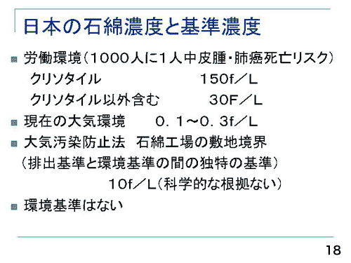石綿については非常に多くの疫学調査がされています(18)。今、産業衛生学会では、18歳から一日8時間、50年間、リットル150本のクリソタイルを吸い込む環境にいると、1000人に1人の方が中皮腫や肺がんで亡くなるとしています。クリソタイル以外ですと、1リットル30本の環境の中で、18歳から50年間、一日8時間、1年間に250日職業的に働くと、1000人に1人が中皮腫や肺がんになります。現在の大気環境は、リットル0.1〜0.3本くらいですが、今環境省及び自治体の担当者が、「1リットル10本が大気汚染防止法の石綿工場の敷地境界の濃度でこれ以下だから安全です。WHOも認めています。」という様なお話をすることが多い。ところが、あくまでこれは石綿工場の敷地境界で、仮にずっとそこにいたら、1リットル30本で1000人に1人が亡くなる訳です。こういう環境基準で良いのかということが十分に議論されていないわけです。おそらく今後、日本の環境基準としては、かなり下げないといけません。基本的には10万人に1人、100万人に1人が発症するくらいのレベルで環境基準を定めなくてはいけない。今の大気中でも、十分病気が起きている方がいるのではないかということが、今リスク関連の学者の間で問題となってきている訳です。