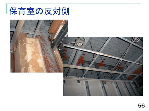 保育室の反対側では、赤い鉄骨に吹き付けられていたアスベストが飛散し、赤い鉄骨が確認出来る部分が、左の写真の柱にも、右の写真の天井でも、よくわかると思います(56)。その後保護者の要望から委員会がつくられ、健康対策が始まりました。