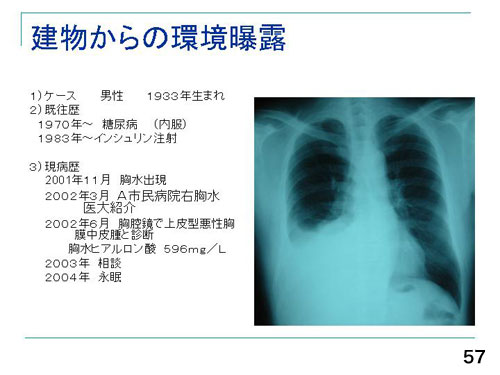 環境曝露では、建物の吹きつけ石綿からの中皮腫の発症が知られています(57)。この方は右の肺の外に胸水が溜まっていて、悪性胸膜中皮腫と判明しましたが、アスベストの職歴がありませんでした。