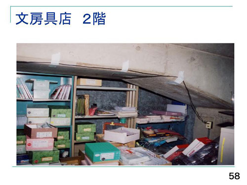 おつとめしていた文房具店は、1階に文房具店があり、2階が倉庫でした(58)。どこかでアスベストを吸っていないかと聞かれ、「そうだ2階に青いものがある。」と思われたそうです。実は文房具店の2階の壁に、青石綿=クロシドライトが吹き付けられていました。写真の文具の棚の後ろに青石綿が見えます。