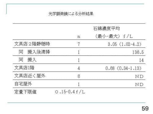 東京労働安全衛生センターの外山尚紀さんが測定したのですが、屋外はほぼ大気中と同じ(59)。1階と2階はわずかだけど石綿濃度が上昇している。濃度の高い搬入後の清掃は月1回のわずかな作業でした。30年間、彼は2階に大体1日1時間、在庫を取りにいったり帳簿をつけたりしていたそうです。