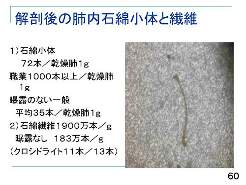 上の写真は、この方の肺を調べたフィルター上の石綿小体のものです(60)。石綿小体は乾燥肺1グラム中に72本で、職業性の場合は1グラム1000本以上、職業や原因のわかる環境の曝露が全くない方が35本ですから、2倍程度でした。石綿繊維を電子顕微鏡で調べると1900万本/gでしたが、ばく露なしの10倍で、繊維の中心はクロシドライトでした。大気中からクロシドライトは検出されませんし、詳細な調査で職業やその他の石綿曝露が十分認められず、この倉庫で青石綿を吸った中皮腫ということがわかりました。