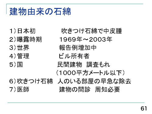 建物由来の中皮腫は日本で初めてで、今後中皮腫の発症では建物の問診も行って頂く時代になってきました(61)。大変残念な事は、民間の1000平方メートルの建物は2005年の建物調査対象ではなく、そこで既に被害が生じている事です。