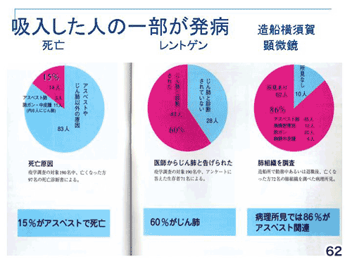 最近の報道を聞くと、吸入した全員がアスベスト関連疾患で亡くなるような不安を持つ方がいますが、全員がなるわけでは決してありません(62)。1994年〜95年私達は、米海軍基地の造船所の疫学調査を行ないました。ボイラー工や断熱工といった造船所でもアスベスト曝露が高度の職種に1947年当時在籍されていた方を48年後に調査したものです。死亡者で見ますと、85%の方はアスベスト以外の理由で亡くなっていまして、老衰の方、脳梗塞や心筋梗塞、胃ガン等いろいろな方がいます。肺ガンや中皮腫や石綿肺等のアスベスト関連疾患で亡くなられた方は、全体の15%くらいでした。しかしレントゲン写真レベルで見ますと、60%くらいの方に石綿肺や胸膜肥厚斑等の関連所見がでています。注意して頂きたいのは、職業性曝露が高度な集団でも、0/1以上の石綿肺や胸膜肥厚斑もレントゲン写真やCT写真で認められない方が40%程度いるという事です。病理所見が得られた人で、石綿肺や胸膜肥厚斑等を確認すると85%くらいの人に何らかの所見が認められました。