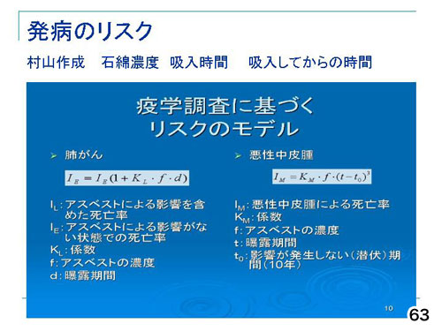 実際に過去にいろんな疫学調査がされたので、石綿のリスクははっきり分かっています(63)。この数式で、あてはめると、計算が出来る。簡単に言うと、石綿濃度と吸入時間と吸入してからの時間によりリスクが決まります。ですからあなたの作業はどうもこれと類似の仕事だから、このくらいの濃度だったんじゃないかな。そして何年経っているという話をある程度科学的にすることは可能です。しかしこの式を出してもなかなか実感として伝わらないので、こういうレベルですから心配ないとか、このくらい心配ですから定期的に健診しましょうというようなお話をしています。