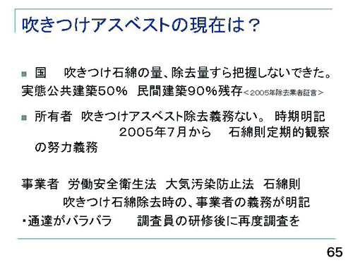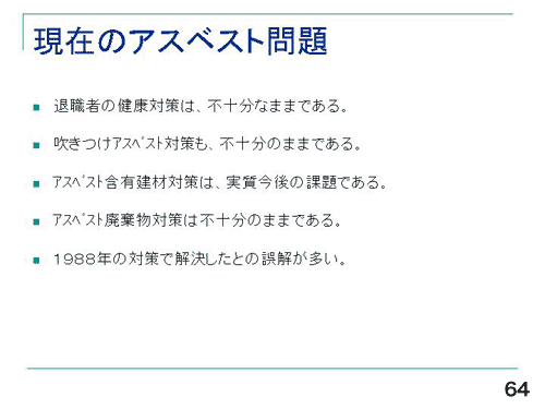 あと二つだけ話します(64)(65)。吹き付けアスベストは1975年に問題になりました。重要な発癌物質ですから本来、日本のどこにどれだけ吹きつけ石綿があるのか調査が行われていなければなりません。ところが現在吹き付け石綿の量すら国が把握しておらず、現在ようやく調査しているわけです。本来1975年にしなくてはいけなかった事です。