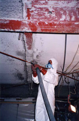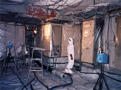 このような調査は業者の了解が得られないと、勝手に行って測るということはなかなか難しく、一般に低い濃度しか測定できないという限界があります。散水をしないまま建物を壊す(非除去解体)と、最も高濃度の数値が得られると思われます。私が測定できたのは吹き付けアスベストを除去している間、または除去後の解体現場であります。これがその建物の中の除去の様子です。