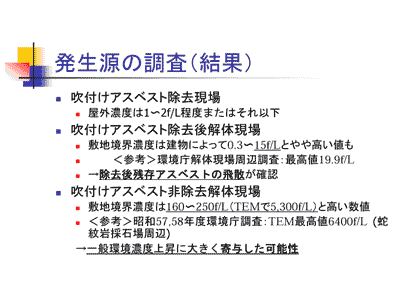 寺園: どうもありがとうございます。一点目の飛散係数につきましては、日本では文献がありませんでした。海外(アメリカ)のほうでいくつか文献がありまして、今のような建築物の解体現場から調査した文献ではないのですが、アスベスト廃棄物を乱暴に取り扱った場合の飛散状況を調べた文献から引用すると、およそ0.01%程度であるということがわかりました。文献もあるので必要ならば後でご説明しますが、数%というようなオーダーではなく、もう少し低くて0.01%のオーダーであるというものです。ただし、それが小さいと言うことではなく、あくまで飛散の対象となるバルク状の物質がドサッとある中で、それを乱暴に取り扱えば0.0数%のアスベストが飛散するということであり、飛散したアスベストの濃度を考えれば決して小さいものではないと思われます。