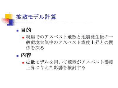 除去が終わってから壊す場合、少し高い濃度がありました。15本/Lです。これについては除去後であっても建物に残存したアスベストがあって、それが飛散した可能性はあるだろう、と考えました。ただし、それでも非除去解体に比べれば、かなり低いです。吹きつけアスベストを除去せずに解体するは、非除去解体に比べれば、かなり低いです。非除去解体の場合は、環境監視研究所の中地氏が測ったように160-250本/Lでした。それを私が電子顕微鏡で確認させて頂いて、クロシドライトを確認し、電子顕微鏡による濃度は5300本/L。(この意味は一般の光学顕微鏡による濃度とは違います)でした。数百本/Lという高濃度の飛散というのは、被災地の解体現場で比較的頻繁にあったのではないかと考えられます。これが、一般環境濃度の上昇に寄与した可能性は大きいであろうと考えました。では本当にどれぐらい寄与したかと考えたいと思いまして、拡散モデルを使って計算致しました。