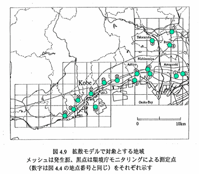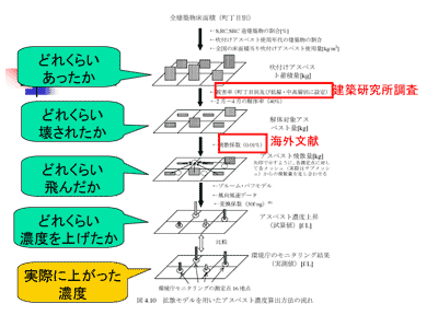 地震発生後のアスベスト濃度を環境庁がモニタリングしたような、濃度上昇に対して、発生源の影響はどれぐらいあったかということを考えようと思ったものであります。まず、詳細は省きますが、阪神淡路大震災の被災地域での全建築物の床面積を建築研究所のデータから取りまして、そこから構造別、年代別のデータを使いまして、吹付けアスベストが一体その地域でどれぐらいあったかということを計算し、その後でどれぐらいかを計算し、その後でどれぐらい飛んだかを計算します。