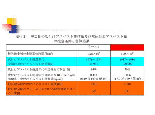 この中で被害率については建築研究所が発表している数値を使いました。また、飛散係数、例えば1kgのアスベストがあったときそのどれくらいが舞うか、については文献がありましたので、0.01%という値を使用しました。ケースの2(17万トン使用されていたという場合)を使いますと、阪神淡路大震災の地域で吹き付けアスベストの蓄積量というのは、3740トンくらいあったと推測されます。
