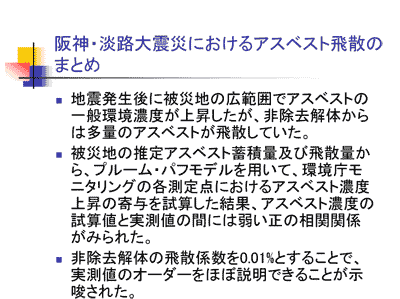 それから吹き付け以外のアスベスト含有建材につきましては、確かにおっしゃられたように石綿スレートのバール破砕からの飛散の危険性は私も認識しております。京都大学におりました時に、吹き付けアスベストの調査もやりましたし、石綿スレートの調査もやりました。但し、阪神淡路大震災につきましては、石綿スレートの存在量や、それを解体している影響についての調査まではできませんでした。正直なところ吹付つけアスベストの調査ですら、当初早い復興を希望する被災地の方々を前にしては、現地の優先順位を考えるとなかなか難しい部分があると感じました。ただ数カ月経ってからは、吹き付けアスベストの危険性というのはやはりちゃんと総括しておくべきと感じましたし、現地でも問題意識は高まってきましたので、調査に踏み出しまして、実際の協力も得られました。その時に、全体の優先順位を考えた私の意識として石綿スレートまでは到達できませんでしたし、実際に調査しようとしても力量的に難しかったと思います。あまり答えになっていませんがご理解頂ければ幸いです。