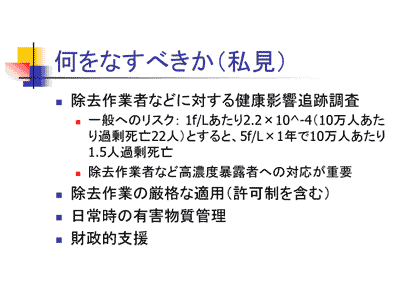 私が一番重要だと考えますのは、除去作業者等に対する健康影響の追跡調査です。かなり粗いですが、一般環境へのリスクについては、ユニットリスクというものを利用して計算することは可能です。ユニットリスクとは1本/Lという濃度を生涯(75年間)ずっと吸い続けますと、10万人あたりの過剰死亡は22人と考えられる、というものです。これを仮に、先程の環境庁のモニタリングに当てはめます。一般環境での濃度5本/L、それが1年続いたとして、非常に大まかに言って10万人あたり1.5人程度の過剰死亡が発生する恐れがあるのではないかと考えられます。これは神戸の人口150万、周辺を合わせて200万として計算した場合、数十人オーダーの過剰死亡があるのではないかと、単純にユニットリスクから計算することはできます。
