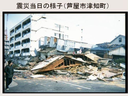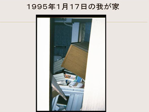 中地: 最初に、地震がどうだったのか、写真を見ていきたいと思います。私は芦屋と神戸の境に住んでいました。当日の雰囲気です。書斎がメチャクチャです。