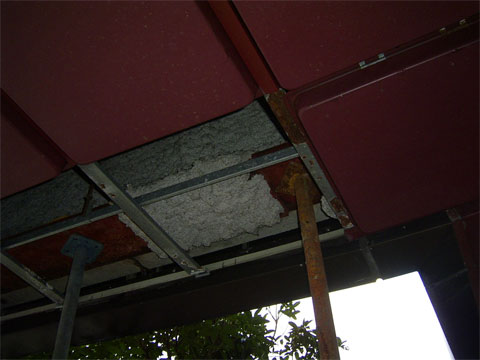 川口町は既に分析を実施し、石綿の含有はなしとの調査を行っていました。同時期に吹き付けられた川口町役場の玄関天井も一部落下し、岩綿吹きつけが見える状態となっていましたが、私達の分析でも同様に石綿の含有はありませんでした。