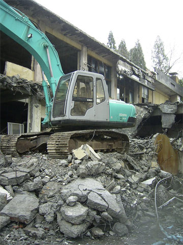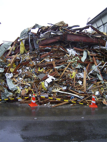 続いて川口町を初めて訪問しました。地震の被害が激しく、民家の倒壊が目立ちました。ビルが少ないため、吹きつけ石綿のある建物は多くはないようでした。町では主に民家の解体が進行中でした。