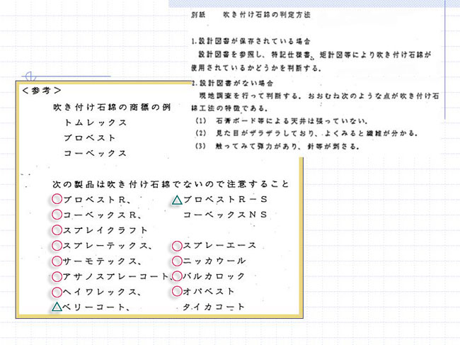 第3の最大の問題は、調査対象が不備だった事です。このような判定の方法でアスベストを発見しなさい、と昭和62年の通達では、参考として吹き付けアスベストの商標として3つ挙げています。トムレックス・ブロベスト・コーベックスの、有名な吹き付けアスベストです。次に『次の製品は吹き付け石綿ではないので注意すること』とわざわざリストで指示を出しています。「次の製品」リストに私が丸と三角で印を付けましたが、丸は後に環境庁が『アスベスト製品だ』と断言したもので、三角の二つはアスベスト含有が疑わしい製品です。これらの製品がリストにある15品目のほとんどを占めています。当時の文部省の指示は全くのでたらめで、吹きつけ石綿せないとした「次の製品」の中にアスベストが含まれている物が相当あったのです。