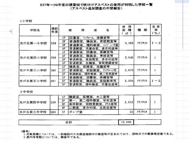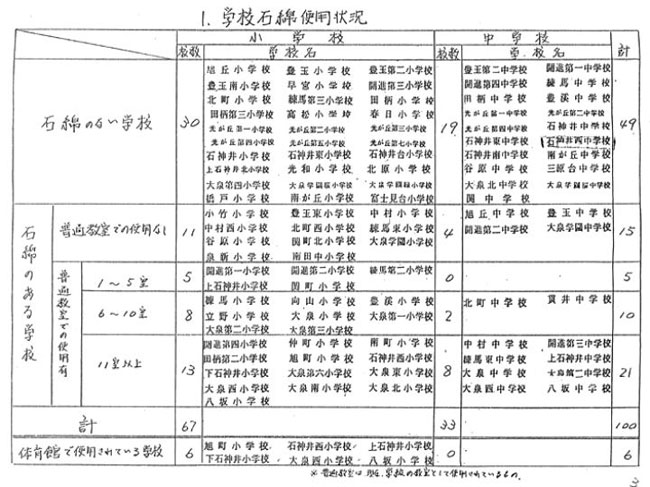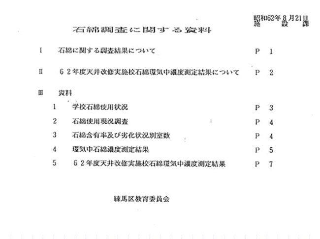 昭和62年に練馬区の教育委員会はアスベストに関して実に綿密な調査をしています。私達が最初に練馬区に行った時はこの資料は無いとされていましたが、教育委員会が捜してくれた結果出てきました。他の自治体より熱心に調査をして対策を練ったことが分かりました。