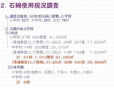 昭和62年通達は、吹き付けロックウールについての調査をせよとは書いてなかったので、多くの自治体がこの調査をしなかったということです。練馬区もどちらかというと、吹き付けアスベストの調査はしたけれどもロックウールについてはしなかったのです。しかも練馬区は吹き付けロックウールの比率が高かった自治体なので、現在まで残ってしまったというわけです。現在多くの自治体で、未だに公共施設で吹き付けロックウールを含めた吹き付けアスベストが相当数残っているであろうと思います。その他パーライト吹き付けやバーミキュライト(ひる石)吹き付けの石綿含有等も、その後少しは書いてはあったけれど、まだ問題化されていなかったので調査しなかった。そのためアスベストが各自治体に残っているということです。学校の吹き付けアスベストのある範囲の問題は1987〜88年頃に片付いたけれども、残りの多くの問題が実は片付かないまま現在まで来ている、そのことが問題だということです。