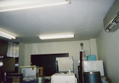 これは私どもの組合員から3年前に提供していただいた写真ですが、鉄骨の建物の1階のテナントのリフォームを頼まれた。これが一見普通の天井と壁ですので、照明器具をはずしてリフォームの準備をした。養生していますね。20-30年前の建物で、この写真をくれた仲間はたまたま労働対策部の役員さんでしたので、石綿に詳しかった。天井を一部切り抜いてみると、明らかな吹き付け石綿でした。施主に話をしたのですが、職人のためも含めてきちんと処理をしなければこのままでは工事は続行できないとして、で仕事が流れた。