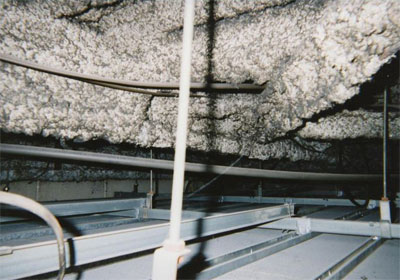 鉄骨の耐火被覆戸デッキ材裏の断熱材ですが、これはさすがにアスベスト吹きつけは禁止されていますから、ロックウール吹き付けとされています。壁の石綿スレート板はまだ実際には貼っていない状況でしたが、これは仕様書通りにいけば、この壁にこれから石綿スレートが貼られる所であります。