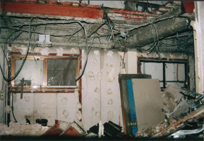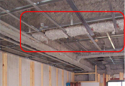 ちょっと脱線しますが、この部分を見てください。私達が現場で、どういう風に石綿に曝露をするのか? 現場と設計図はしばしば矛盾します。天井の高さをとるために、本来設計が完璧ならばこんなことはないですが、実際にはこういうふうに岩綿吹きつけを一部削り取ってやらなければ天井高が確保できない。つまりもともとアスベストを扱うという自覚なしに、大工、電気、設備等の工事の過程でいじってしまうということです。