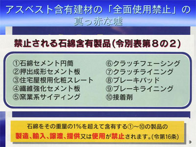 結論を申しますと、今年10月からアスベスト含有建材使用が禁止されるということですが、役所は「原則禁止」といって「全面禁止」とは言っておりませんが、「1987年の学校アスベストパニックで石綿の問題が終わった。」と思われているのと同じように、この10月からの法施行で「これでもうアスベストの危険はない。」と皆さんが思うような現状があります。「これは真っ赤なうそですよ。」と申し上げたい。