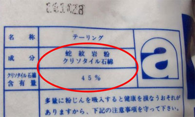 左官用モルタルが今問題になっていて、最後にこの問題を申し上げたいのですが、これはテーリングといって、混ぜてのびを良くしてひび割れを防ぐもので、去年3月に買ってきたものです。クリソタイル45%含有で、しかも粉体、粉のままの状態です。左官屋さんの作業をお分かりかと思いますが、モルタルに混ぜて使うものです。この製品の主要なメーカーは昨年夏くらいから自主回収して、ノンアスベスト製品に変えたようでした。ところがこの7月厚生労働省は、「左官用モルタル混和材の石綿含有について」という資料を出しました。ノンアスベストを唱っている左官用モルタル混和材に、石綿含有が現在もあることが判明したというのです。「今までの成分分析法では、石綿のクリソタイルは発見できなかった。しかし違う方法で分析をしたら、今まで無石綿表示していたものに(はなはだしいのは「ノンアスエース」という商品名で)、実は90%クリソタイルだという製品も判明した。」と言うわけです。しかもこのモルタル混和材は、今度の10月から製造も使用も禁止される製品10品目に入っていないのです。「石綿含有製品の製造使用が禁止」といっていながら法の網の目からこぼれている製品の1例です。