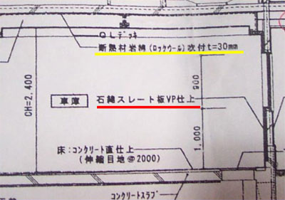 一例をあげますと、設計図書に指定があります。昨年11月の江戸川の現場で、昨年11月に新築した2階建て鉄骨。1階が車庫で、2階が住まい。これは建築中の現場写真ですが、その設計図の中の断面図で屋根はどういう材料にしなさいよとか、天井はどうしなさいよというのがあります。この断面図の1階車庫の壁のところ、不燃材を使わなければならないところですが、材料と仕上げの指定に「石綿スレート板VP仕上げ」があります。VP仕上げとは水性のペンキを塗りなさいということです。